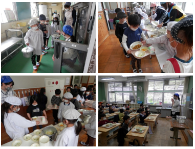 今日から1年生でも給食が始まりました。給食の配り方やもらい方を学習し、準備に取りかかりました。みんな初めてとは思えないくらい上手に用意をすることができていました。今日のメニューはカレーです。教室のあちこちから「美味しい!」という声が聞こえてきました。
